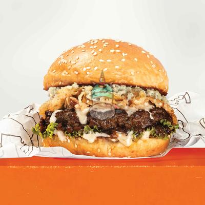 House-Blend Beef, Bleu Cheese Sauce, Bleu Cheese Crumble, Caramelized Onions, Peppered Onion Tanglers, and Green Lettuce