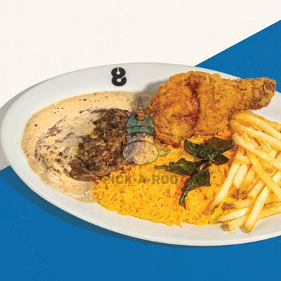 1 pc Heavyweight Fried Chicken, Burger Bomb, House Rice, Skinny Fries or Onion Rings, Iced Tea