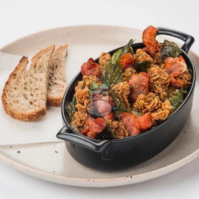 Creamy Cheese Macaroni topped with Crispy Bacon and Chicken Popcorns