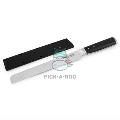 • The KitchenAid® bread knife features sharp serrations to cut through a variety of soft-crusted breads and pastries with ease. Blades are expertly crafted using semi-polished, high-carbon Japanese steel, hardened and tempered to provide a long-lasting edge for a professional, quality cut every time. This KitchenAid® knife features an eastern-style ergonomic handle that provides optimal control for everyday use. This handle is expertly engineered with a textured finish for a comfortable grip and accented with a chrome endcap. Includes a custom-fit blade cover for secure, safe storage. KitchenAid® knives are top rack dishwasher safe. To extend the life of your cutlery, hand washing is recommended. Dry immediately.